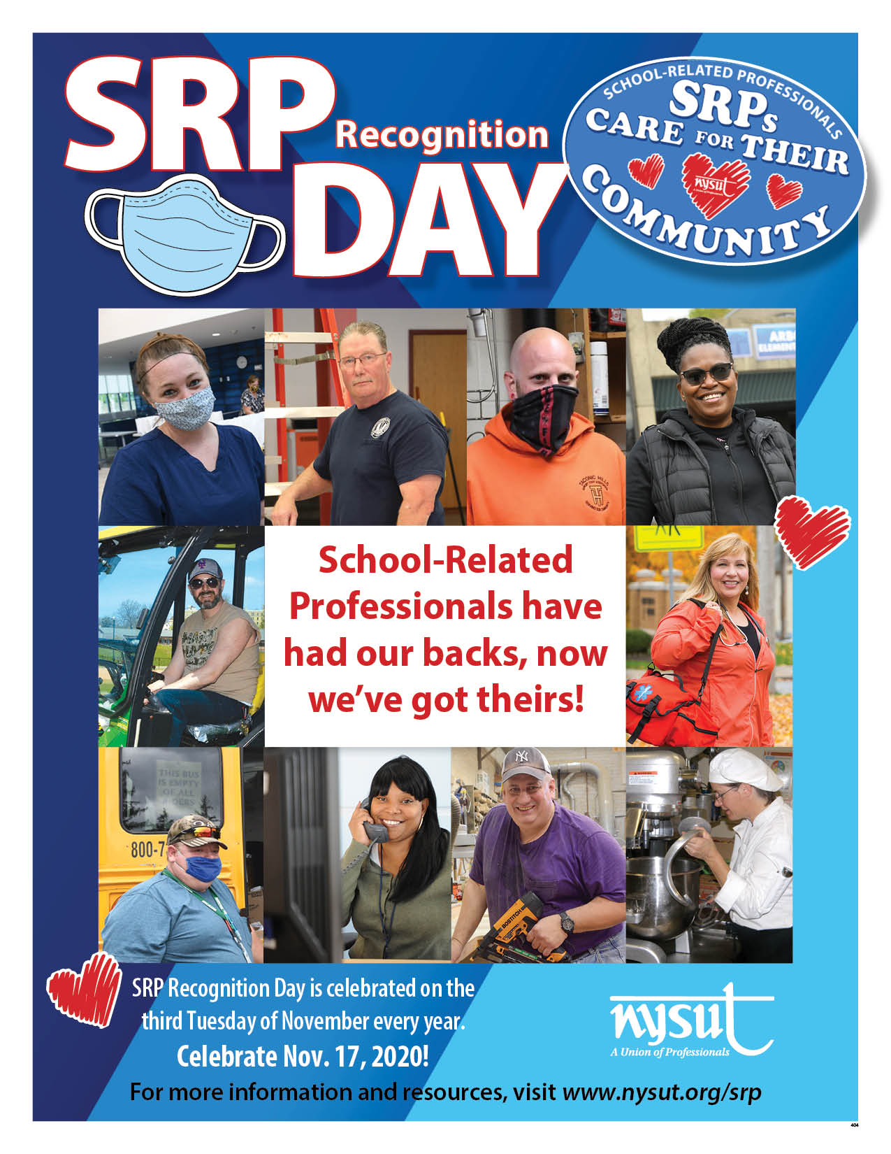 Upon request by SRP local leaders, NYSUT will send out free celebration packets that include celebration suggestions, posters and “SRPs Care for their Community” car magnets* for the SRPs in your local. (Request by Nov. 1! Be prepared for Nov. 17, 2020.)