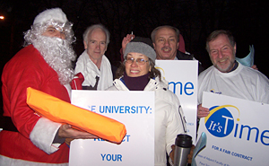Pawlowski and Basile were joined in the picketing by their fellow adjuncts, as well as union members from other higher ed and NYSUT K-12 locals who made the trip to the campus 30 miles north of New York City in a show of solidarity. In a brisk wind, pickets struggled to keep aloft placards that read " Pace University: Respect Your Professors!" and "It's Time for a Fair Contract!" Passing motorists honked horns in support of the adjuncts, as Santa stood nearby with a red sack full of "gifts" for Pace President Stephen J. Friedman that included rubber rats and coal.