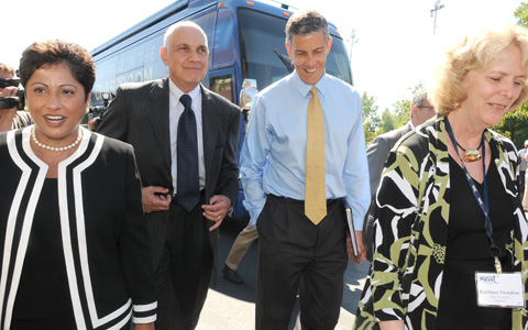 In a historic stop at NYSUT Headquarters on the third day of his back-to-school tour, Duncan thanked NYSUT President Dick Iannuzzi, Vice President Maria Neira and assembled teachers, administrators and other partners for their "tremendous courage, tremendous leadership and a real commitment to changing the status quo" to do what's best for students.