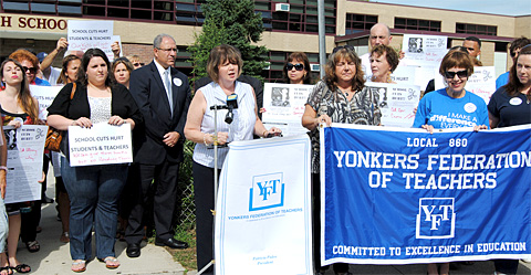 Yonkers Federation of Teachers President Patricia Puleo and NYSUT Executive Vice President Andrew Pallotta held a news conference Monday to outline the painful impact of $1.3 billion in education cuts on Yonkers, which has a solid record of student achievement despite being a low-wealth, large city district.