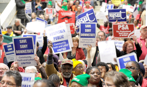 Supporters of the imperiled SUNY Downstate Medical Center chanted, shouted, sang and prayed at a rally Tuesday at the Legislative Office Building in Albany that drew nearly 700 NYSUT members, other unionists, clergy, lawmakers and community activists.
