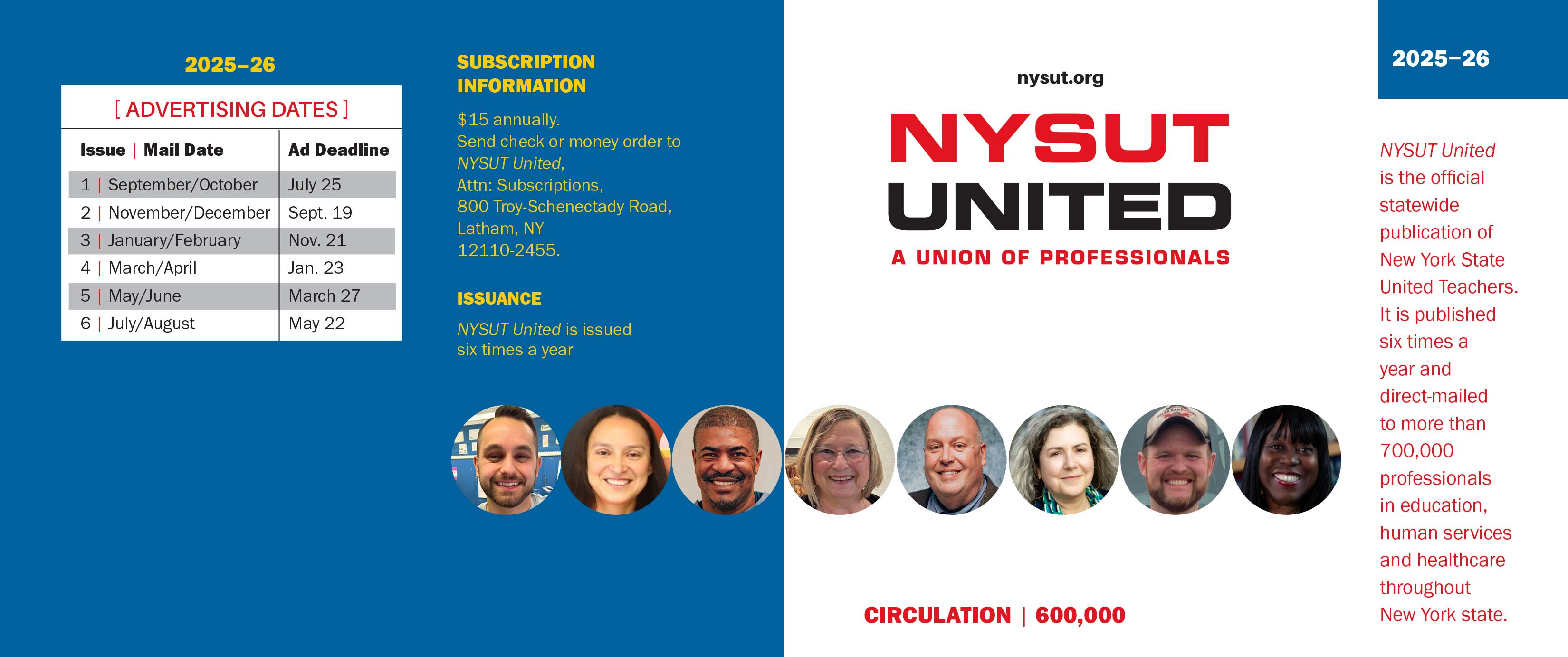 NYSUT United, the official award-winning publication of New York State United Teachers is published six times a year and is direct-mailed to the homes of more than 600,000 education, human services and healthcare professionals across New York state. Our readership relies on NYSUT United for vital information, including news about best professional practices; opportunities for professional learning; analysis about trends in education and healthcare; and retirement options. Our members include teachers, librarians, other school professionals, higher education faculty, human services, healthcare professionals, municipal employees and retirees.