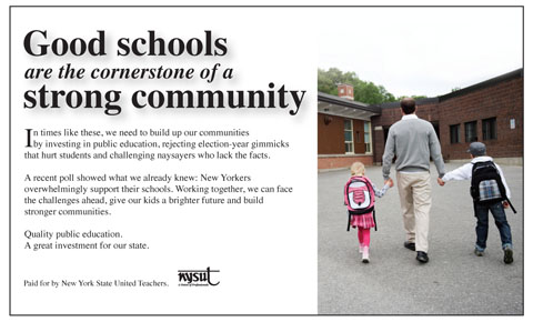 NYSUT has launched a statewide advertising campaign reminding New Yorkers that good schools build strong communities and warning them against election-year gimmicks and uninformed naysayers.