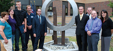High school junior Dakoda Ball, third from left, helps unveil the Springville-Griffith Institute school district 9/11 memorial sculpture. More than 65 students in grades 6-12 in the western New York district entered a contest last year to select a design. Ball's winning design uses a steel beam salvaged from the World Trade Center and depicts each site impacted on Sept. 11, including the twin towers, the Pentagon and the Shanksville, Pa., field. Standing with Ball, from left, are his grandmother, Janet Tedesco; mom Sandy Welty-Ball; his dad, Dale Ball; and Lee Cutler, NYSUT Secretary-Treasurer. Technology teacher Tim Baumgartner; social studies teacher Robert Valenti; and art teachers Charles Houseman and Angela Ginnitti, members of the Springville Faculty Association, all assisted in the construction of the sculpture. Photo by Dennis Stierer.