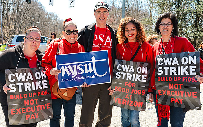 After 45 days of the largest strike in recent history, nearly 40,000 CWA/IBEW members at Verizon emerged victorious. The unions agreed on a contract that will improve working families' standard of living and create good union jobs. They also achieved a first contract for wireless retail store workers. NYSUT members across the state, including in Valhalla, above, stood shoulder to shoulder with their brothers and sisters. Their presence on picket lines and contributions to the strike fund were immeasurable. Be the union! Photo by Kristy Leibowitz.