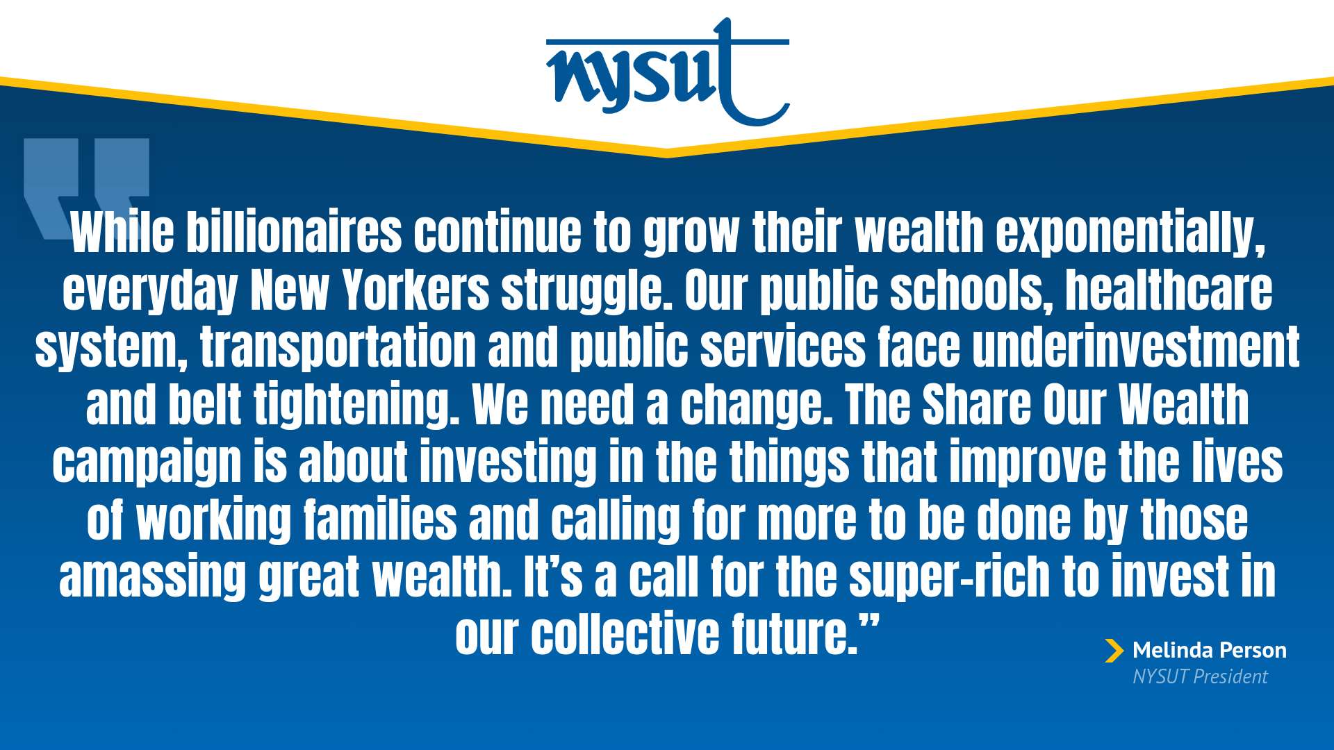 January 27, 2025 Statewide Coalition of Unions, Faith and Community Groups Urge New York to Adopt Share Our Wealth Fair Share Tax Proposals Source: NYSUYT Media Relations
