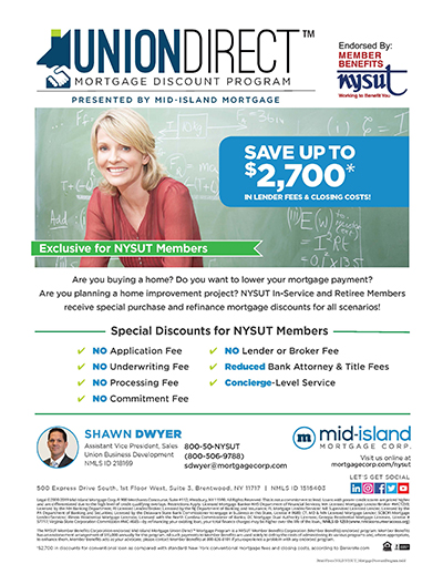 NYSUT members can save up to $2,700* on lender fees and closing costs with the UnionDirect Mortgage Discount Program presented by Mid-Island Mortgage, thanks to: